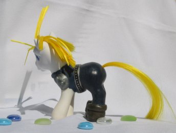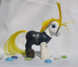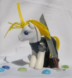 While there are many disputes about whether or not Final Fantasy VII was a good game, there are none that it is the most famous of the never-ending series. Cloud Strife is the main character and now appears in pony form. Clothing, including boots, belt, and shoulder spike have been sculpted onto the body of a Flutter Butter. Lullabelle's head has been added to create an unique pose and rehaired in bright yellow hair. This has then been styled to resemble the spiky 'do that Cloud sports. In addition to his recreated sculpted clothing, he also has his oversized Buster Sword with him.